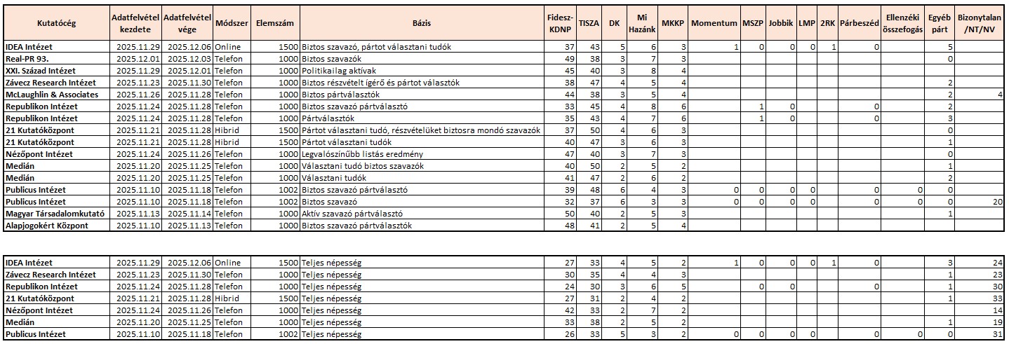 A Publicus Intézet novemberi kutatása alapján a biztos szavazó pártválasztók körében a TISZA Pártnak 48, míg a Fidesz-KDNP-nek 39 százalékos a támogatottsága. A bejutási küszöböt rajtuk kívül csak a DK lépné át valószínűleg (6 százalék). A Mi Hazánk Mozgalom 4, míg az MKKP 3 százalékon áll.