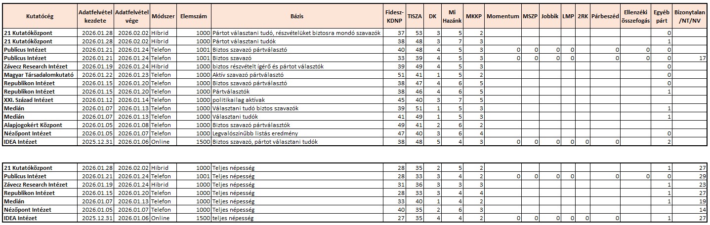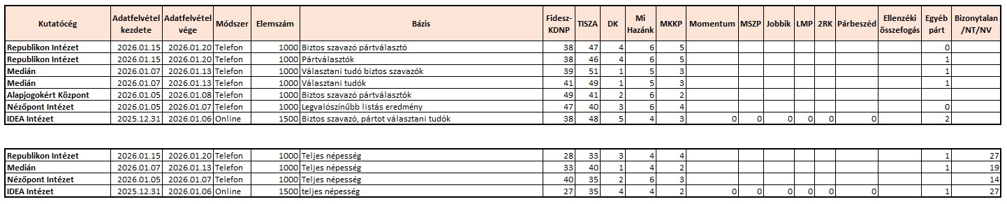 A Republikon Intézet január közepi felmérése szerint négypárti parlamenti alakulna. A biztos szavazó pártválasztók körében vezet a TISZA Párt (47 százalék), míg a Fidesz-KDNP 38 százalékon áll. A Mi Hazánk és a Kétfarkú Kutyapárt is bejutna még a parlamentbe (6, illetve 5 százalék), a DK 4 százalékos támogatottságával viszont nem lépné át a bejutási küszöböt.