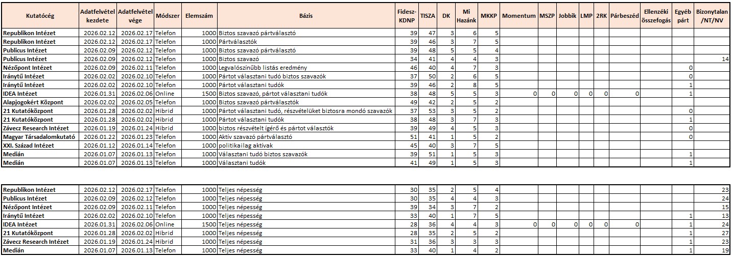 A Republikon Intézet február közepi felmérése szerint négypárti parlamenti alakulna. A biztos szavazó pártválasztók körében vezet a TISZA Párt (47 százalék), míg a Fidesz-KDNP 39 százalékon áll. A Mi Hazánk és a Kétfarkú Kutyapárt is bejutna még a parlamentbe (6, illetve 5 százalék), a DK 3 százalékos támogatottságával viszont nem lépné át a bejutási küszöböt.
